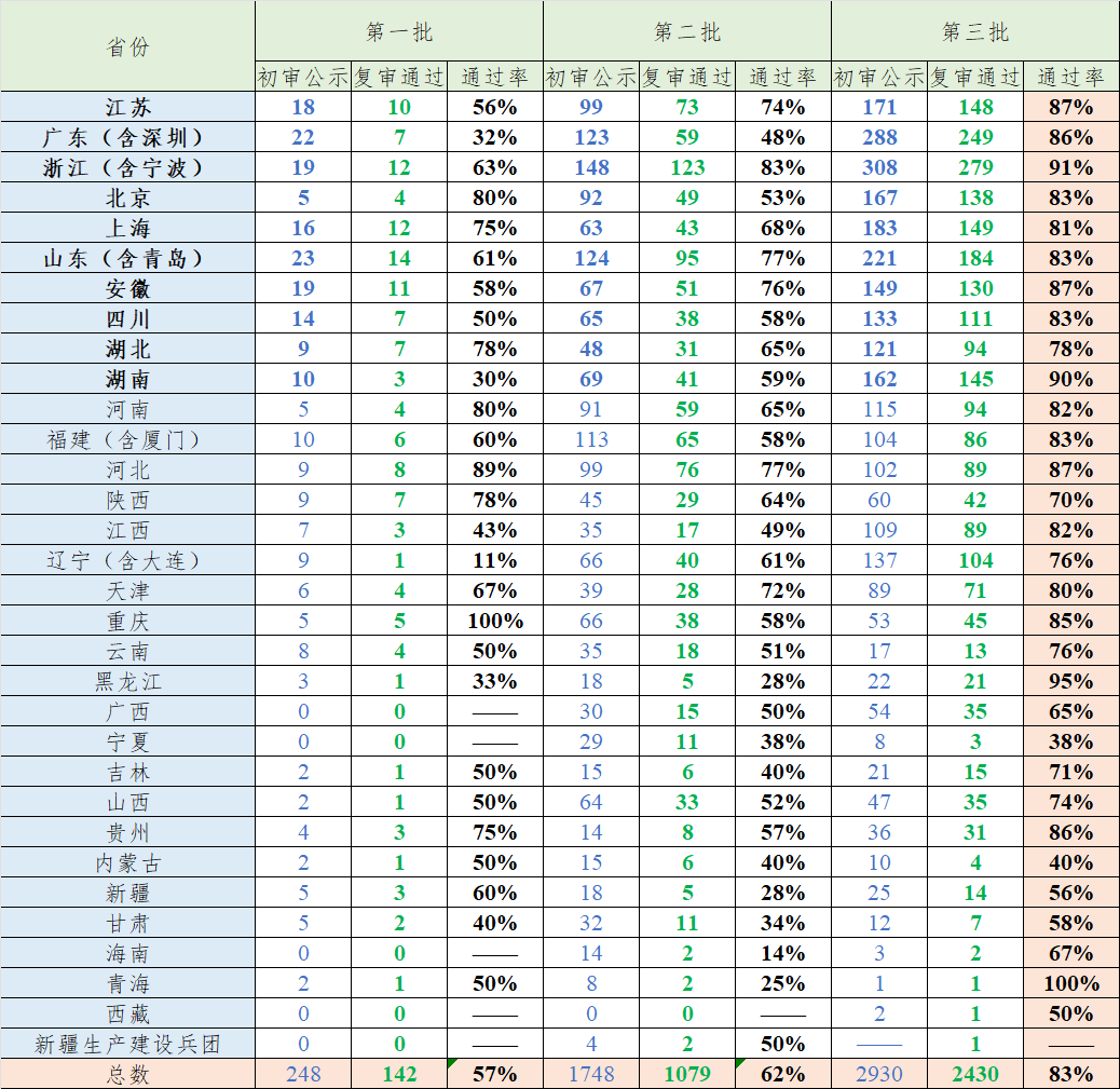 3.各省市前三批小巨人復審通過率一覽
