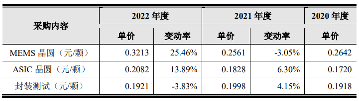 2020年度與2021年度,公司的原材料平均采購(gòu)單價(jià)較為穩(wěn)定。2022年度晶圓采購(gòu)單價(jià)漲幅較大,主要原因系上游代工在產(chǎn)能緊張背景下提高了供貨價(jià)格,以及當(dāng)年度單價(jià)較高的ASIC晶圓采購(gòu)占比提高所致。另外,公司MEMS晶圓代工廠主要為臺(tái)積電和VIS,上述兩家代工廠均采用美元結(jié)算;2022年度,由于美元對(duì)人民幣匯率持續(xù)走高,一定程度上拉高了當(dāng)年度晶圓采購(gòu)單價(jià)。