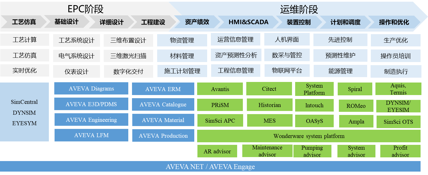 施耐德于2014年收購英維斯(Invesys),2017 年反向收購劍維,并將英維斯的業務與劍維整合。原來英維斯的軟件,包括用于化工流程模擬的 PRO/II、用于換熱設備和網絡優化的HEXTRAN、用于動態過程模擬的 DYNSIM、用于在線實時優化的ROMeo等,現在都集成在劍維品牌下,形成了工程設計集成平臺AVEVA E3D、IE&D、流程模擬平臺軟件、資產績效管理套件,提供從工程設計、工程建設、數字化交付到生產運營全生命周期的解決方案,如圖 4 所示。