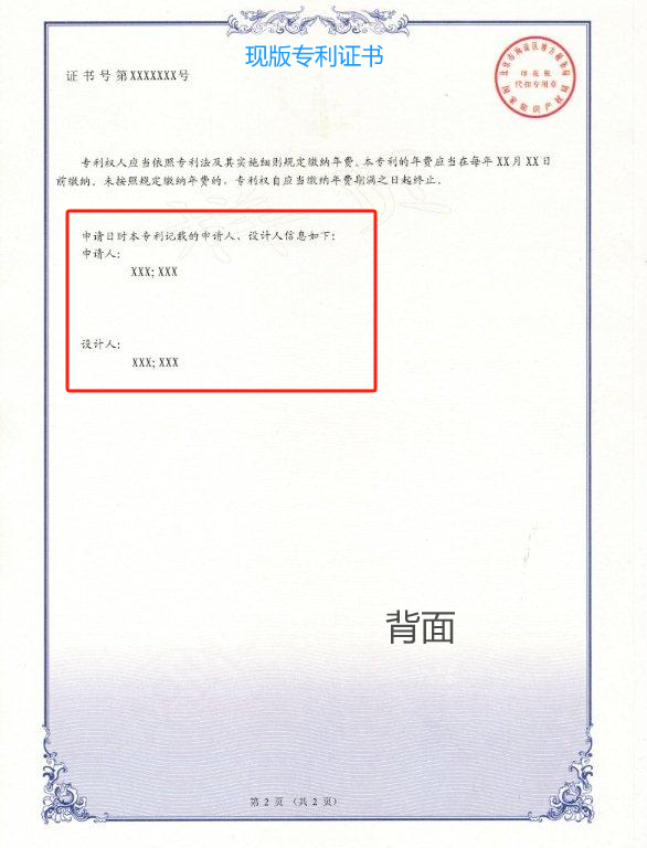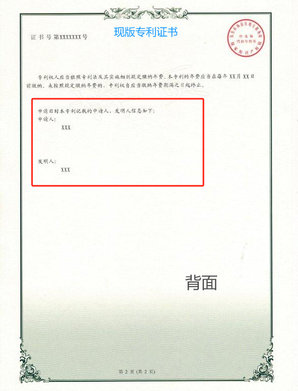 2.專利申請日時申請人、發明人信息,從證書背面來到證書正面。