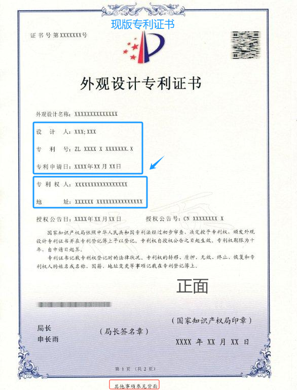 此外,實用新型專利證書和外觀設計專利證書也有相同變化。