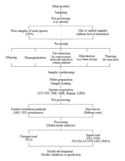 各種光譜分析技術(shù)已被用于肉類物種鑒定。一些研究揭示了光譜分析技術(shù)在正確鑒別肉制品中肉類品種的重要性。然而,這些方法依然存在一些技術(shù)上的限制,為給肉類行業(yè)提供一個有力的解決方案,應(yīng)在充分考慮到所有的限制和過程變量的基礎(chǔ)上,對這些技術(shù)復合應(yīng)用。