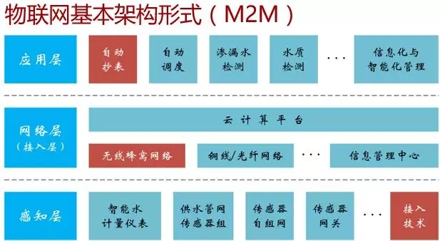大家都知道,互聯(lián)網(wǎng)的基本架構(gòu),是人與人的信息交互。而物聯(lián)網(wǎng),是M2M,就是機(jī)器與機(jī)器之間的交互。目前簡單的劃分,可以將其分成三個層次,最下面的是感知層,即儀表和傳感器,網(wǎng)絡(luò)層是解決數(shù)據(jù)安全傳輸?shù)膯栴},應(yīng)用層將采集到的數(shù)據(jù)進(jìn)行業(yè)務(wù)處理等。