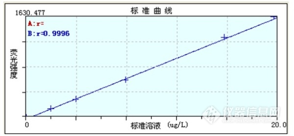 標(biāo)準(zhǔn)曲線繪制,取1000μg/mL銻標(biāo)液稀釋成1000ng/mL的標(biāo)準(zhǔn)工作液,分別吸取0mL,0.2mL,0.4mL,0.8mL,1.6mL和2.0mL銻標(biāo)準(zhǔn)工作液,置于100mL容量瓶中,加入5mL鹽酸加入10mL硫脲溶液(100g/L),室溫放置30min,混勻,用去離子水定容,配置成0ng/mL,2ng/mL,4ng/mL,8ng/mL,16ng/mL和20ng/mL的標(biāo)準(zhǔn)系列溶液。繪制熒光強(qiáng)度-濃度標(biāo)準(zhǔn)曲線。