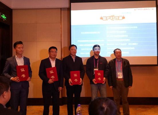 頒獎(jiǎng)留念(左至右:重慶永生銷售經(jīng)理沈榮華,奧龍星迪總經(jīng)理費(fèi)宏,丹東百特總經(jīng)理董青云,濟(jì)南微納總經(jīng)理任飛,中國儀器儀表行業(yè)協(xié)會(huì)高級顧問閆增序)