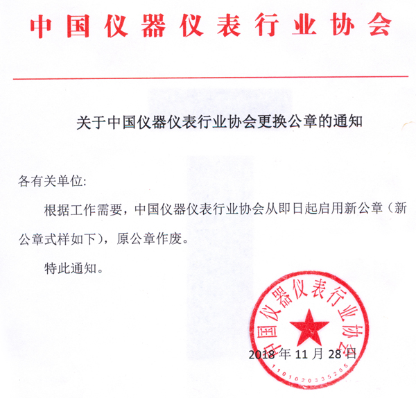 根據工作需要,中國儀器儀表行業協會從即日起啟用新公章(新公章式樣如下),原公章作廢。