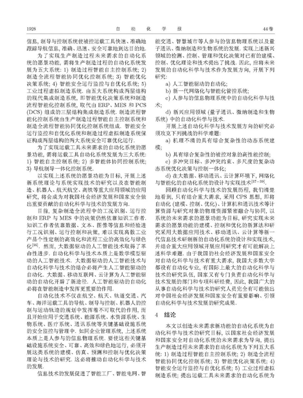 摘要:本文結合中國自動化科學與技術的發展狀況和中國絕大多數大學設有自動化專業的現狀, 借鑒自動化科學與技術發展歷程中的成功經驗, 結合國家社會經濟發展和國家安全對自動化系統的未來需求, 以生產制造系統、重要運載工具和人參與的信息物理系統為主要對象, 以自動化系統的發展方向— 智能自主控制系統、智能優化決策系統和智能優化決策與控制一體化系統的愿景功能為目標, 以研究實現愿景功能的建模、控制與優化新算法和新的自動化系統的設計方法和實現技術以及結合重大應用領域開展的應用研究為主線, 提出了自動化科學與技術的發展方向, 并結合新興應用領域對自動化科學與技術的需求與挑戰, 提出了未來自動化科學與技術的發展方向.