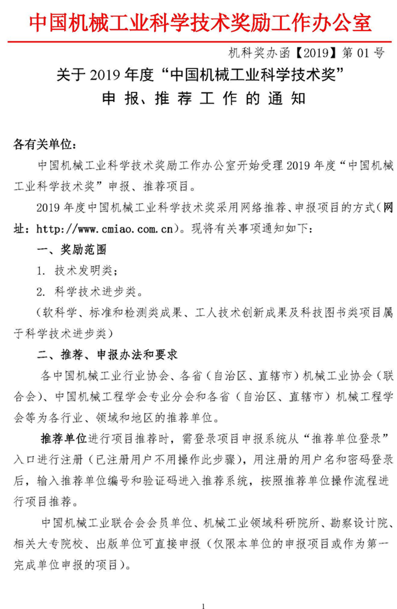 關于2019年度“中國機械工業(yè)科學技術獎”申報、推