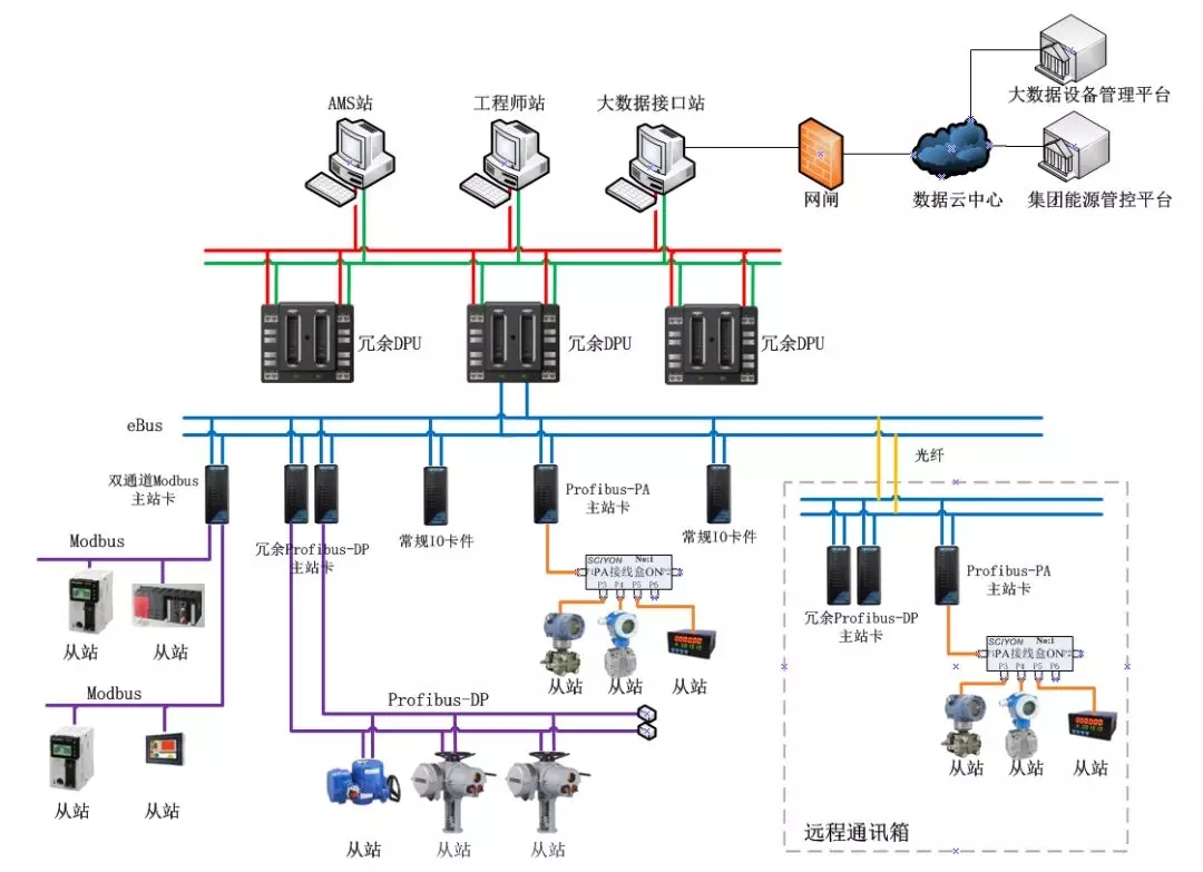現場智能設備可以連接到多樣的現場總線協議主站卡,兼容性、擴展性強;可以通過光纖連接至主站卡,也可以就地安放通訊箱,結構多樣。IO網絡連接IO卡件和現場總線主站卡,同時兼容多種現場總線,如Modbus、Profibus、FF、HART等。eNet為雙冗余百兆以太網,通過SyncAMS、SyncBASE數據庫采集、存儲數據并上傳至云中心。大量數據的提取對智慧電廠的發展打下堅實基礎。