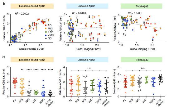 檢測結果顯示,外泌體結合的 Aβ 蛋白與認知程度呈顯著的相關性,而未與外泌體結合的 Aβ 蛋白和血漿總 Aβ 蛋白沒有顯示這種相關性(圖3),這證實了研究者之前的猜測:特定類型的 Aβ 蛋白才與 AD 相關。
