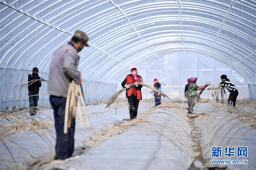 農戶在寧夏銀川市賀蘭縣立崗鎮蘭豐村村集體育苗溫室項目打理秧苗(222日攝)。
