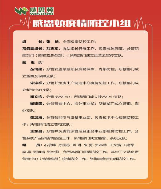 自疫情發生以來,市、區黨委政府和集團黨委高度重視,多次指導、督促公司開展疫情防控工作。1月26日開始,威思頓領導班子第一時間即著手研究、策劃疫情防控工作。根據集團公司黨委統一部署,威思頓成立了以董事長總經理為組長、領導班子其他成員為副組長、各部門負責人為組員的疫情防控領導小組,下設11個支隊、每個支隊下設5個小隊。雙管齊下,統籌安排,一手強抓人員排查、門禁管理、日常防控、應急管理等疫情防控工作落實,一手強化安全生產管理,嚴控各項風險,確保公司穩定運營和安全生產。