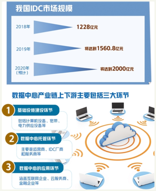 根據(jù)前瞻產(chǎn)業(yè)研究院的數(shù)據(jù),2018年我國IDC市場規(guī)模為1228億元,2019年將達到1560.8億元,同比增長27.1%,按照該統(tǒng)計口徑,且考慮到政策支持力度的加大,預(yù)計2020年數(shù)據(jù)中心的市場規(guī)模將達到2000億元。