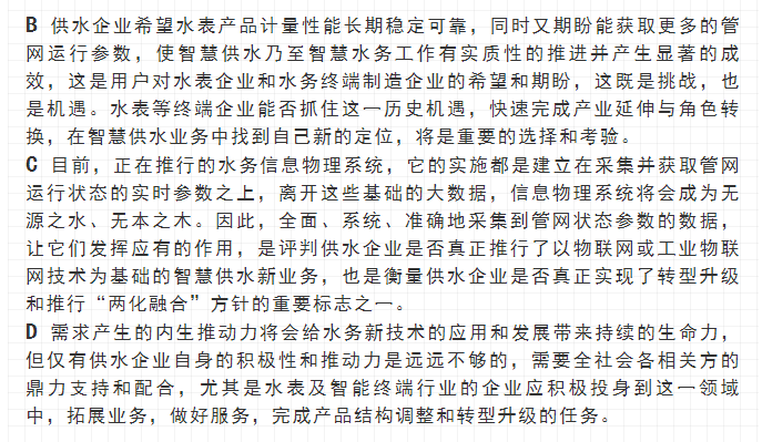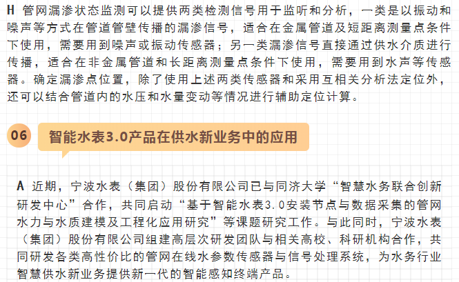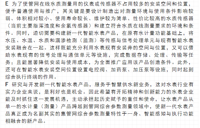 最近,寧水集團已正式啟動新一代智能水表(智能水表3.0)產(chǎn)品及供水新業(yè)務(wù)系統(tǒng)的商用化研發(fā)工作,在原先公司多個博士后課題研究基礎(chǔ)上進行商品化與工程化應(yīng)用研究。可以預期,在不遠將來公司將為供水管網(wǎng)系統(tǒng)提供高性價比的水務(wù)綜合大數(shù)據(jù),為管網(wǎng)現(xiàn)代化管理提供信息來源與決策依據(jù)(這方面詳細內(nèi)容可參見附錄:“水表產(chǎn)品演進之路——從智能水表1.0/2.0產(chǎn)品向智能水表3.0產(chǎn)品邁進”一文)。至2020年初,公司在與浙江大學控制科學與工程學院合作基礎(chǔ)上,又先后與同濟大學環(huán)境科學與工程學院、寧波大學信息科學與工程學院等高校共同簽訂戰(zhàn)略合作協(xié)議,并聯(lián)合成立了“水務(wù)新技術(shù)研發(fā)實驗室”和“水務(wù)信息感知研發(fā)實驗室”,并將與寧波工業(yè)互聯(lián)網(wǎng)研究院等科研機構(gòu)就水務(wù)新型傳感技術(shù)、供水關(guān)鍵核心業(yè)務(wù)等的解決方案展開合作研究。