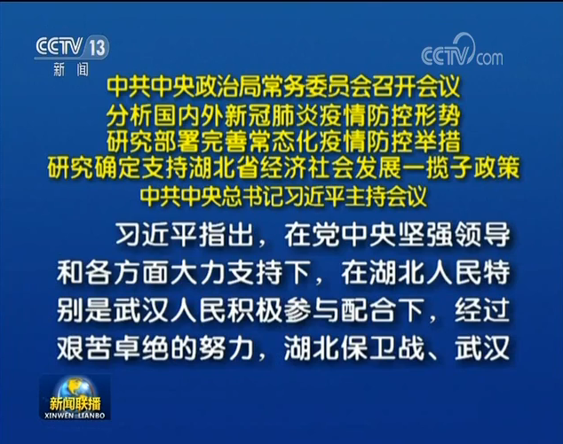 新華社北京4月29日電 中共中央政治局常務委員會4月29日召開會議,分析國內外新冠肺炎疫情防控形勢,研究部署完善常態(tài)化疫情防控舉措,研究確定支持湖北省經濟社會發(fā)展一攬子政策。中共中央總書記習近平主持會議并發(fā)表重要講話。