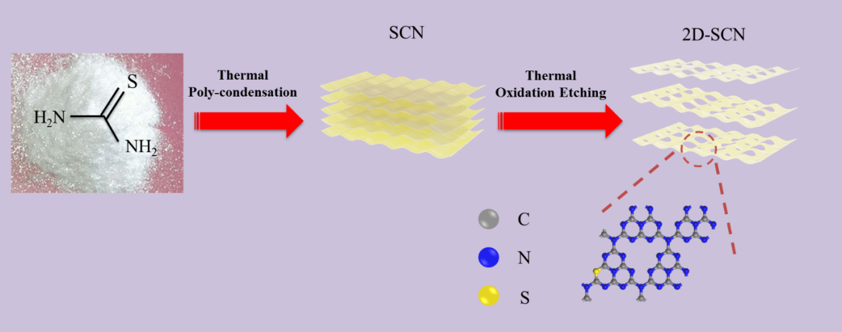 為解決光催化劑在應用中存在的光生電荷復合嚴重、可見光利用率及光催化效率低的問題,在苑明哲研究員的帶領下,廣州分所環(huán)境與能源光催化實驗室提出將硫元素原位摻雜于g-C3N4分子結構中,并通過高溫氧化刻蝕的方法成功制備了超薄的二維結構硫摻雜光催化材料,增強了材料對光的吸收,實現(xiàn)了光催化材料光生電荷的定向遷移,大大提高了光催化劑的催化效率。