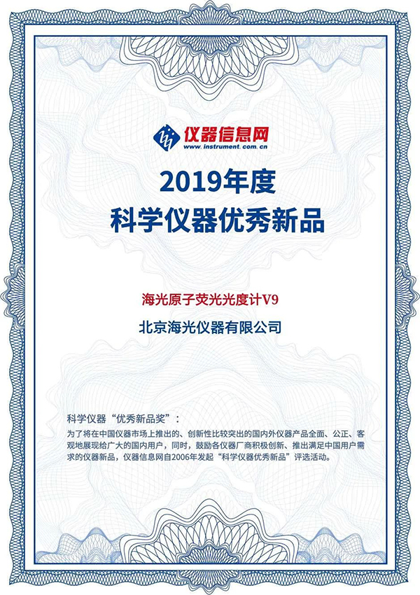 2020年5月20日,由儀器信息網(wǎng)主辦,“科學(xué)儀器優(yōu)秀新品”評審委員會、“新品首發(fā)”欄目承辦的科學(xué)儀器“優(yōu)秀新品獎”在線發(fā)布盛典盛大召開,2019年度科學(xué)儀器“優(yōu)秀新品獎”獲獎名單首次在云端揭曉,海光HGF-V9原子熒光光度計榮獲該獎項。