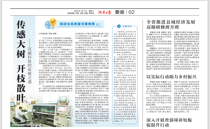 7月7日,《河南日報》要聞版大篇幅報道點贊漢威科技集團,刊出《傳感大樹,開枝散葉——漢威科技的延鏈之道》報道,評價漢威已形成了獨具特色的“以傳感器為核心,智能儀器儀表為支柱,行業(yè)應用為導向”的完整產業(yè)鏈,牢牢掌握住了物聯(lián)網產業(yè)鏈的“微笑曲線”的兩端。
