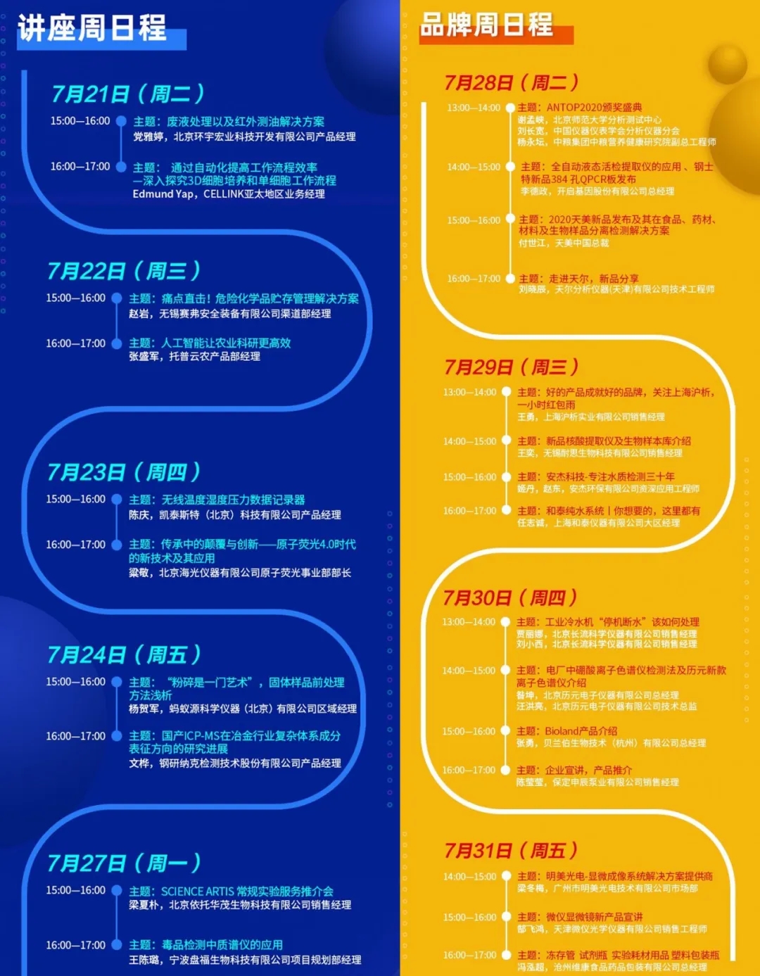 “線上直播”部分,7月21日-31日將有26場次的線上直播,包含了“講座周”、“品牌周”兩大板塊。“講座周”以傳播普及先進技術和經驗為主要內容,“品牌周”以產品推介為主要內容。歡迎科學儀器行業(yè)從業(yè)者于7月20-31日期間,參觀“CISILE線上展覽”,觀看線上直播。