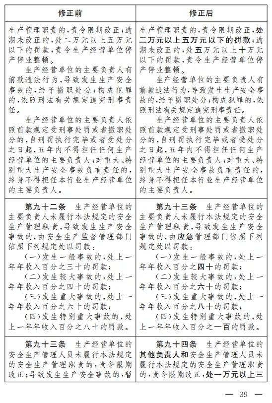 二十四、將第九十二條改為第九十三條,修改為:“生產經營單位的主要負責人未履行本法規定的安全生產管理職責,導致發生生產安全事故的,由應急管理部門依照下列規定處以罰款: