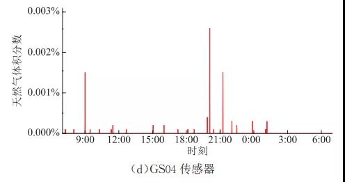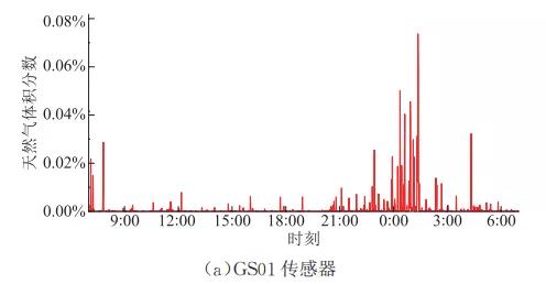 對傳感器運行參數設置完成后,選取系統運行一日的監測數據,分析可知:過濾區與空冷區管道設備種類繁多,包括大量閥門、法蘭等部件,且負責大輸送量的天然氣過濾與冷卻等工藝,其在日常的運行中存在微量泄漏,天然氣體積分數一般處于200×10-6以下,遠低于爆炸極限,處于安全水平。此外,該工藝區在7:00與0:00均監測到較高的天然氣泄漏,此現象與該時間段輸氣壓力較高有關。而增壓區的設備主要是輸氣管道,工藝較為簡單,因此存在的微泄漏現象相比過濾區與冷卻區輕微,天然氣體積分數多集中在100×10-6下。以上監測結果符合壓氣站實際情況,說明該系統具有較好的準確性與實用性。