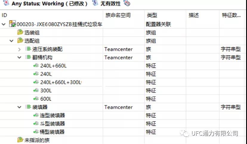 在產品配置器創建族、組、特征。特征為各種可選項的值,族為各種選項,族組用于按某種標準組織各種族。除此之外產品配置器還可以掛接產品線、產品模型對象,用于選項過濾。