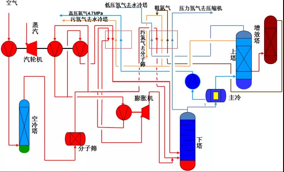 多次的重復(fù)上述過程,氣相的氮濃度就不斷增加,液相的氧濃度也能不斷的增加。這樣經(jīng)過多次的蒸發(fā)與冷凝就能完成整個(gè)精餾過程,從而將空氣中的氧和氮分離開來??諝庠谙滤怀醪骄s為氣氮、污液氮和富氧液空,以節(jié)流閥減壓降溫后送至上塔作為上塔的回流液,進(jìn)一步實(shí)現(xiàn)精餾,最終在上塔頂部得到純氮?dú)猓虏康玫胶细竦囊貉醍a(chǎn)品。