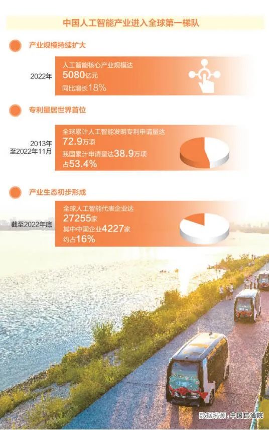 近年來,我國人工智能產業在技術創新、產業生態、融合應用等方面取得積極進展,已進入全球第一梯隊。中國信通院測算,2022年我國人工智能核心產業規模達5080億元,同比增長18%。
