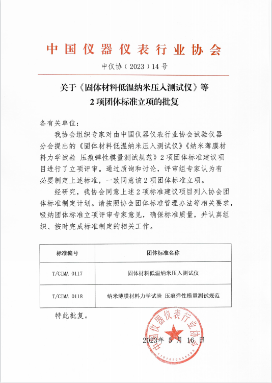 我協(xié)會組織專家對由中國儀器儀表行業(yè)協(xié)會試驗儀器分會提出的《固體材料低溫納米壓入測試儀》《納米薄膜材料力學(xué)試驗 壓痕彈性模量測試規(guī)范》2項團(tuán)體標(biāo)準(zhǔn)建議項目進(jìn)行了立項評審。通過質(zhì)詢和討論,評審組專家認(rèn)為有必要制定上述標(biāo)準(zhǔn),一致同意該2項團(tuán)體標(biāo)準(zhǔn)立項。