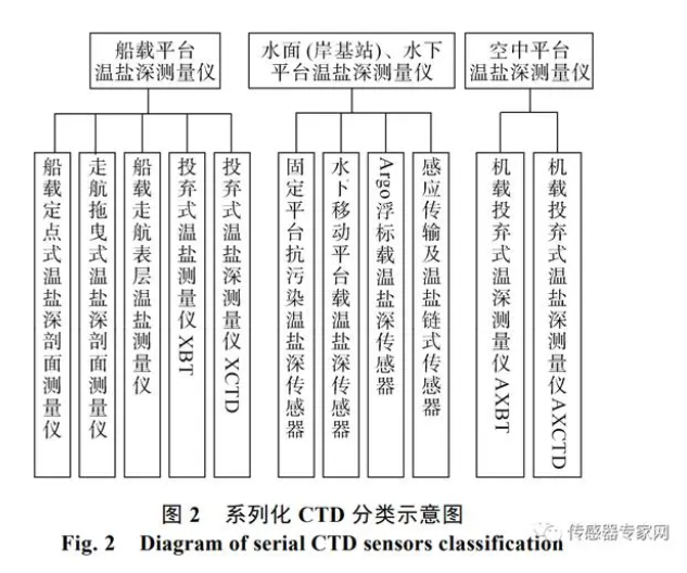 目前, 世界上主要海洋科技強國都擁有自己的 CTD 知名企業(yè), 包括美國 Seabird 和 RDI, 加拿大 AML 和 RBR、德國 Sea & Sun Technology、意大利 IDRONAUT、日本 ALEC 以及英國 VALPORT 等。其中,Seabird 公司的 CTD 傳感器產(chǎn)品在精度、可靠性等方面尤為突出, 占據(jù)了國內(nèi)外大多數(shù)市場份額。一般按照船載、水面和水下、機(jī)載 3 類搭載平臺對 CTD 傳感器進(jìn)行系列化分類, 具體如圖 2所示。