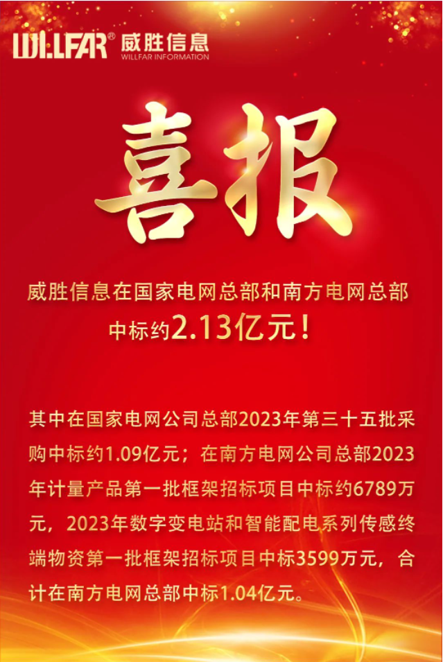 奮力拼搏創(chuàng)佳績,喜報頻傳振人心!6月伊始,威勝信息在國家電網(wǎng)總部和南方電網(wǎng)總部中標(biāo)約2.13億元!其中在國家電網(wǎng)公司總部2023年第三十五批采購中標(biāo)約1.09億元;在南方電網(wǎng)公司總部2023年計量產(chǎn)品第一批框架招標(biāo)項目中標(biāo)約6789萬元,2023年數(shù)字變電站和智能配電系列傳感終端物資第一批框架招標(biāo)項目中標(biāo)3599萬元,合計在南方電網(wǎng)總部中標(biāo)1.04億元。我們將繼續(xù)發(fā)揮領(lǐng)先的科研實力、技術(shù)水平、品牌和服務(wù)能力,為電網(wǎng)公司提供更優(yōu)質(zhì)的產(chǎn)品和服務(wù)。