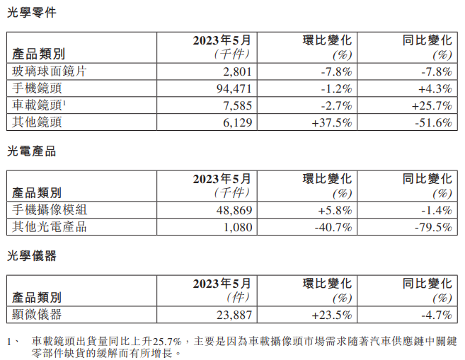 近日,舜宇光學科技公布2023年5月各主要產品出貨量。