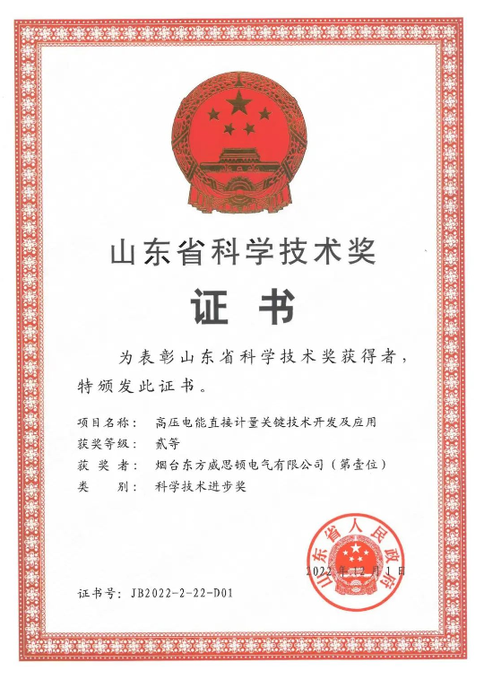 6月20日上午,中共山東省委、省人民政府在濟南召開全省科技創新大會,對2022年度獲得山東省科學技術獎的獲獎項目進行表彰。煙臺東方威思頓電氣有限公司完成的“高壓電能直接計量關鍵技術開發及應用”項目榮獲山東省科學技術進步二等獎。該項目成功研制出0.2S級直接接入式高壓智能電能表,解決了高壓電能無法直接計量的難題,顛覆了傳統高壓電能計量行業,整體項目技術水平達到“國際領先”。