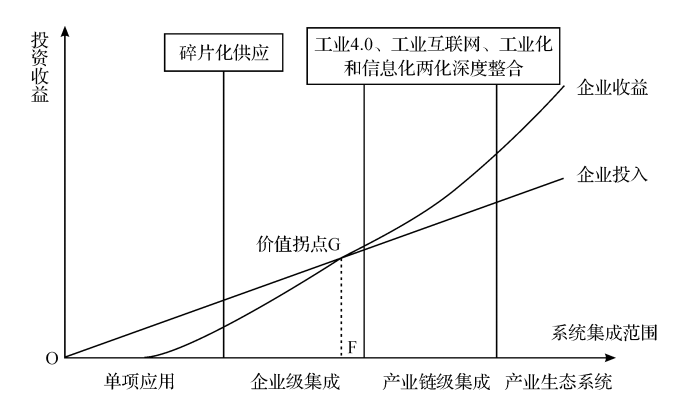 綜上所述,對于制造業數字化改造障礙的認識,國內外學者和企業實踐者基本達成一致:數字化轉型存在兩大基本矛盾,即集成陷阱和中小企業陷阱。“所謂‘集成陷阱’是指企業管理信息的全局優化需求與碎片化供給的矛盾。具體表現為企業在工業化和信息化融合發展的初期階段,各個職能部門各自搞了許多信息系統,卻鮮見信息系統間的連接與集成,最終成為一個個‘信息孤島’”。一般認為,數字化改造只有突破了集成陷阱(突破圖1價值拐點G),企業才會進入工業化和信息化兩化深度融合發展的高級階段,進而進入實質性受益階段。而“所謂‘中小企業陷阱’是指對于廣大中小企業來說,由于缺資金、缺人才,對數字化轉型大都抱有‘不敢轉、不愿轉、不能轉、不會轉、不善轉’的態度;即使有勇于嘗試者,也大都在沒有超越前期沉沒成本(圖1中OF段)、尚未突破“集成陷阱”、數字化改造效果尚未顯現前消耗完了所有的資源。”