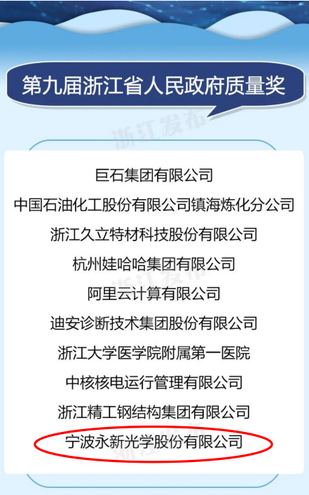 日前,浙江省政府印發(fā)《關(guān)于表彰第九屆省政府質(zhì)量獎(jiǎng)獲獎(jiǎng)組織的決定》,授予永新光學(xué)等10家單位“第九屆浙江省人民政府質(zhì)量獎(jiǎng)”。這也是浙江省政府設(shè)立的最高質(zhì)量獎(jiǎng)項(xiàng)。