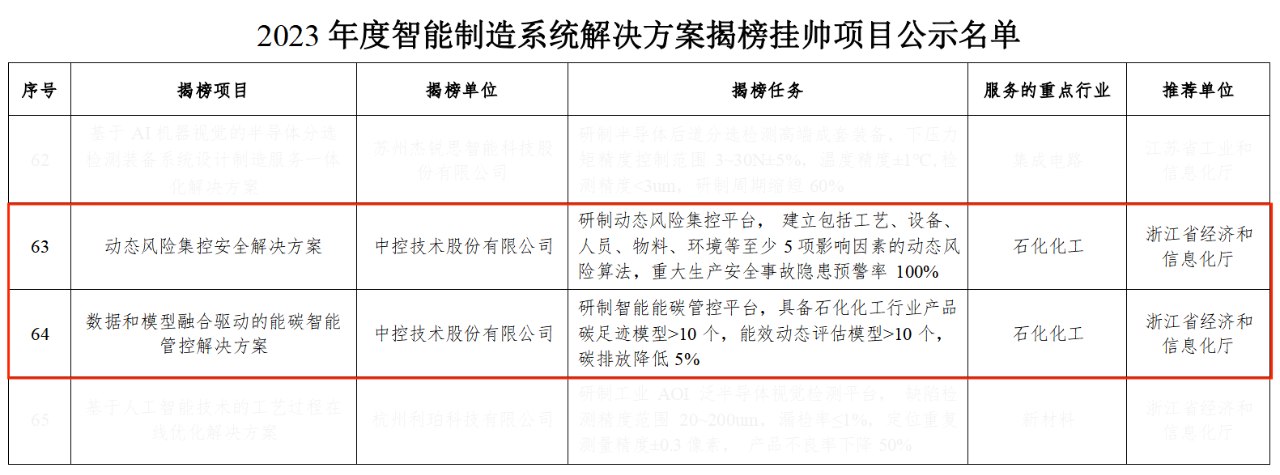 近日,中控技術(shù)股份有限公司(以下簡(jiǎn)稱(chēng)“中控技術(shù)”)的“動(dòng)態(tài)風(fēng)險(xiǎn)集控安全解決方案”和“數(shù)據(jù)和模型融合驅(qū)動(dòng)的能碳智能管控解決方案”成功入選國(guó)家工信部公示的“2023年度智能制造系統(tǒng)解決方案揭榜掛帥項(xiàng)目名單”。