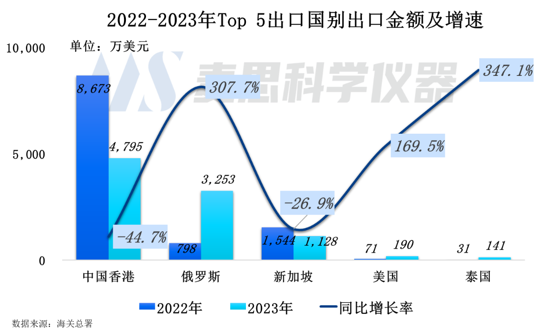 從2023年質譜儀器出口國別結構看,排名前五位為中國香港(轉口貿易)、俄羅斯、新加坡、美國以及泰國,出口金額占比分別為45.6%、30.9%、10.7%、1.8%以及1.3%。