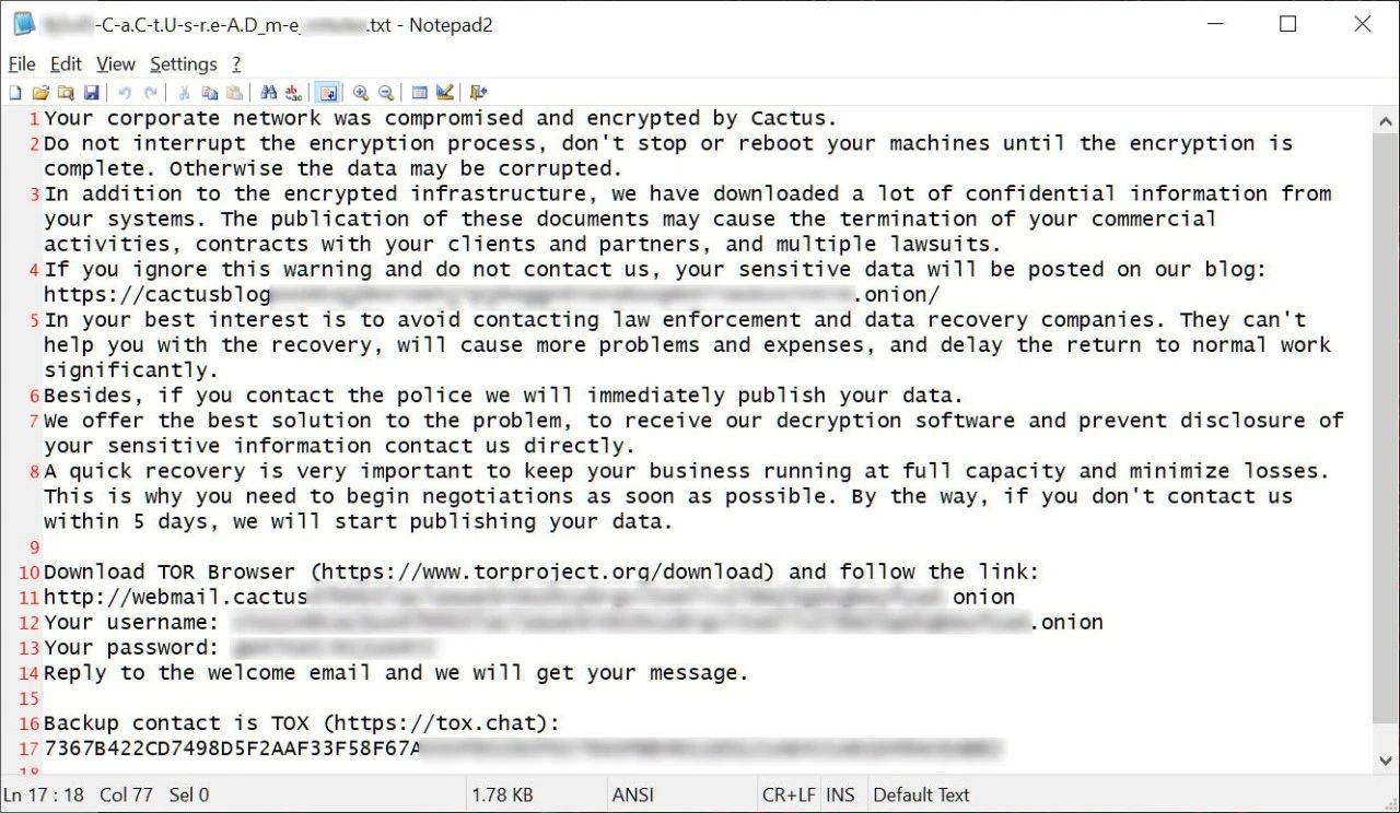 Cactus 勒索軟件行動(dòng)于 2023 年 3 月啟動(dòng),與所有勒索軟件行動(dòng)一樣,威脅攻擊者會(huì)通過購(gòu)買憑證、與惡意軟件分銷商合作、網(wǎng)絡(luò)釣魚攻擊或利用漏洞入侵企業(yè)網(wǎng)絡(luò)。一旦進(jìn)入網(wǎng)絡(luò),就會(huì)悄悄擴(kuò)散到其他系統(tǒng),同時(shí)竊取服務(wù)器上的企業(yè)數(shù)據(jù)。在竊取數(shù)據(jù)并獲得網(wǎng)絡(luò)管理權(quán)限后,威脅攻擊者會(huì)加密文件并留下贖金說明。