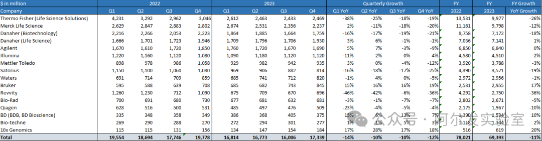 筆者對上市的生命科學的跨國公司做了一個不完全統計,總共挑選了16家公司,對于某些綜合性的公司,例如賽默飛、丹納赫、默克等,筆者挑出了生命科學相關的業務,盡量去除比如診斷、制藥、化工等業務的影響。當然,這其中不可避免混雜了其他非生命科學的業務,例如凱杰和伯樂的診斷業務等,因為數字較小,故沒有進行剔除。默克因為要在3月初公布業績,所以這里的四季度的數據為筆者的估計。