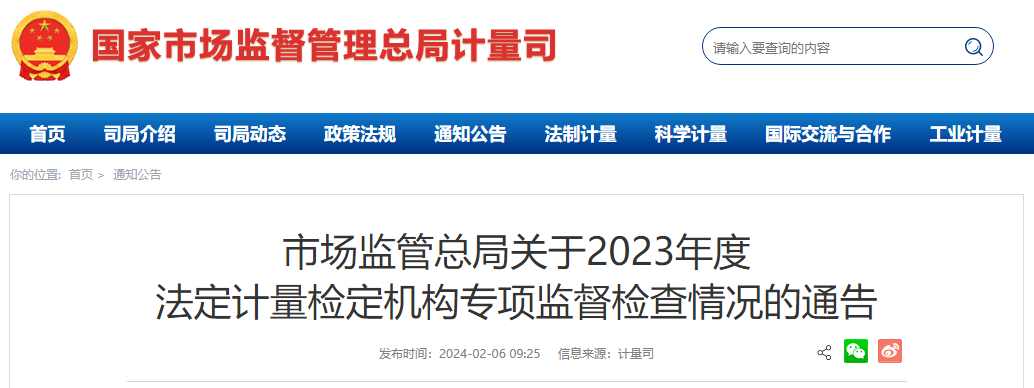 市場監管總局關于2023年度法定計量檢定機構專項監督檢查情況的通告