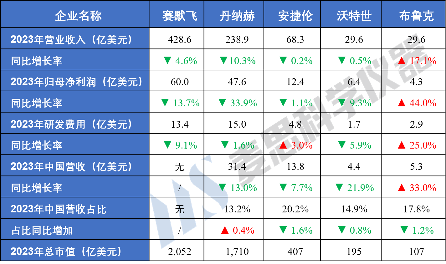 截至2024年2月,賽默飛、丹納赫、安捷倫、沃特世和布魯克已發(fā)布2023年年報(bào)。重點(diǎn)財(cái)務(wù)數(shù)據(jù)如下: