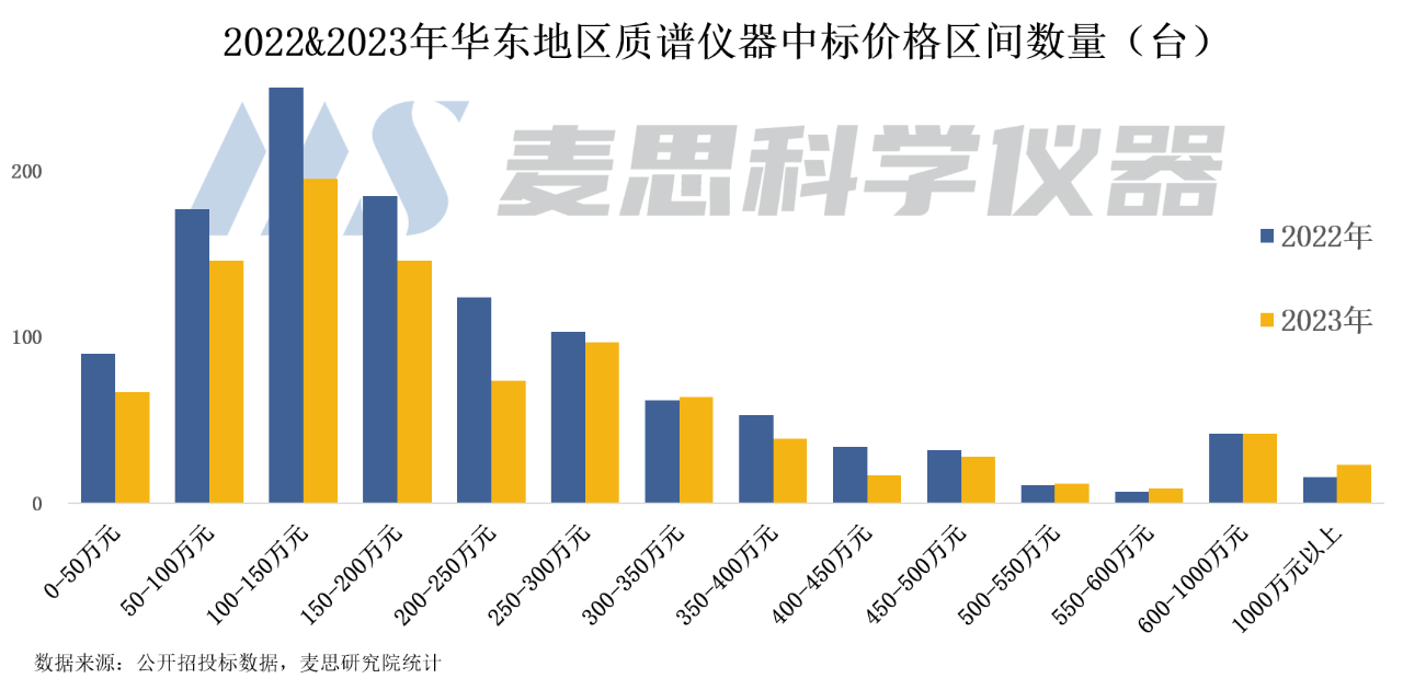從各價格區(qū)間的中標(biāo)數(shù)量來看,華東地區(qū)質(zhì)譜儀器中標(biāo)單價主要集中在350萬元以內(nèi),占比超80%。其中,中標(biāo)單價在100-150萬元以內(nèi)的質(zhì)譜儀器數(shù)量最多,2023年中標(biāo)數(shù)量占比為20%;其次為50-100萬元以及150-200萬元的質(zhì)譜儀,占比均為15%。