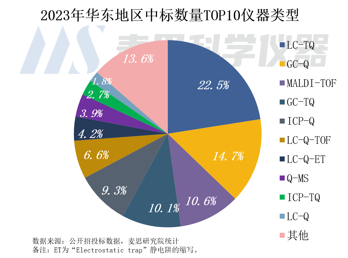 2023年華東地區(qū)中標(biāo)數(shù)量Top10儀器類型分別為LC-TQ、GC-Q、MALDI-TOF、GC-TQ、ICP-Q、LC-Q-TOF、LC-Q-ET、Q-MS、ICP-TQ和LC-Q,合計中標(biāo)數(shù)量占比86.4%。