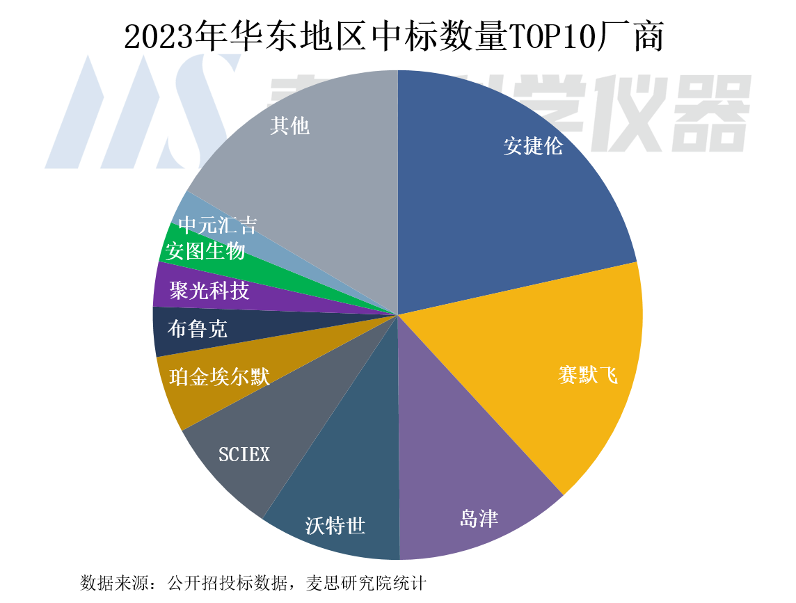 華東地區(qū)質(zhì)譜儀器中標(biāo)數(shù)量Top 5企業(yè)分別為安捷倫、賽默飛、島津、沃特世和SCIEX,Top 5占比超65%。國內(nèi)廠商中,聚光科技、安圖生物和中元匯吉三家企業(yè)進入Top 10行列。