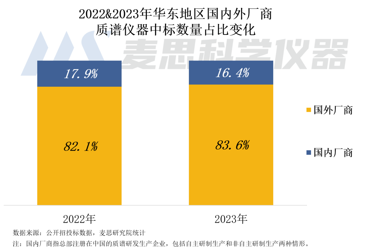 2023年華東地區(qū)國內(nèi)廠商中標(biāo)數(shù)量占比為16.4%,同比下降1.5個百分點。國外廠商中標(biāo)數(shù)量占比為83.6%,高于全國市場平均值(76%),占據(jù)市場主導(dǎo)地位。從二者占比變化可見,2023年國內(nèi)廠商的質(zhì)譜儀器中標(biāo)數(shù)量下降幅度高于國外廠商。