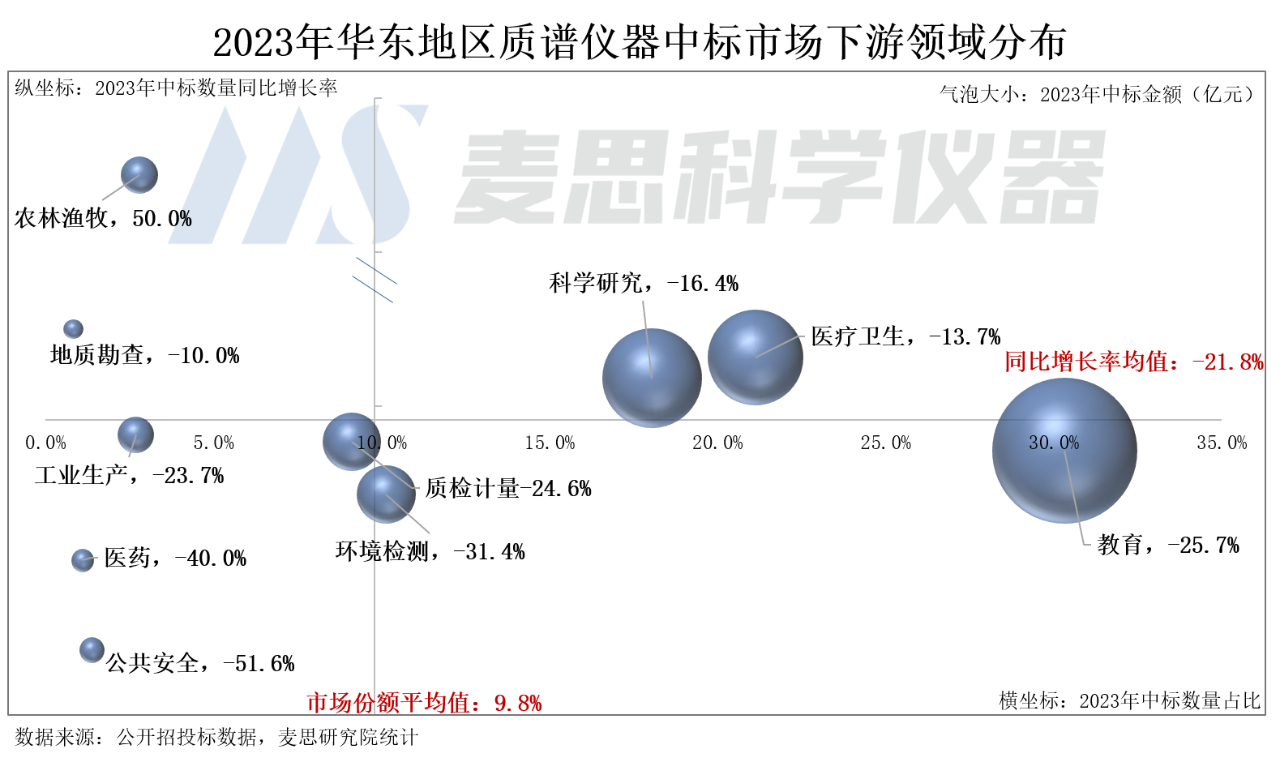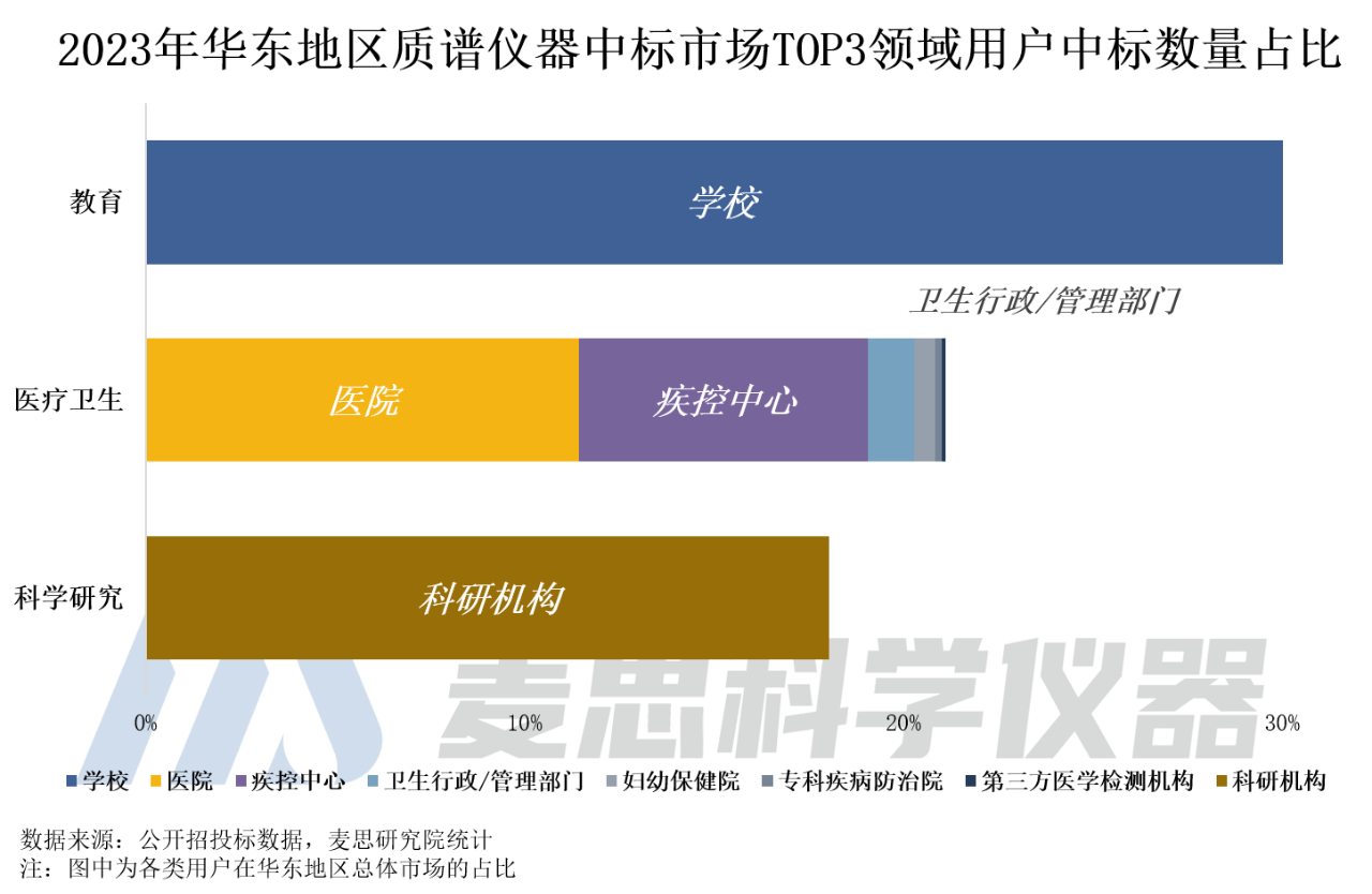 科學(xué)研究領(lǐng)域的用戶為科研機構(gòu),2023年中標(biāo)數(shù)量占比接近20%,是當(dāng)前華東地區(qū)質(zhì)譜儀器中標(biāo)市場的第二大采購群體。