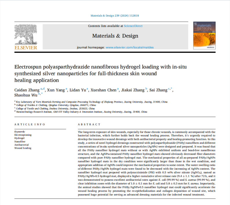 近日,嘉興大學張彩丹與德州學院張賽、青島大學吳韶華合作,在期刊《Materials and Design》(IF=8.4)上發(fā)表了題為《原位合成納米銀/聚天冬酰肼納米纖維水凝膠敷料在全皮層缺損傷口愈合中的應用》的最新研究成果。