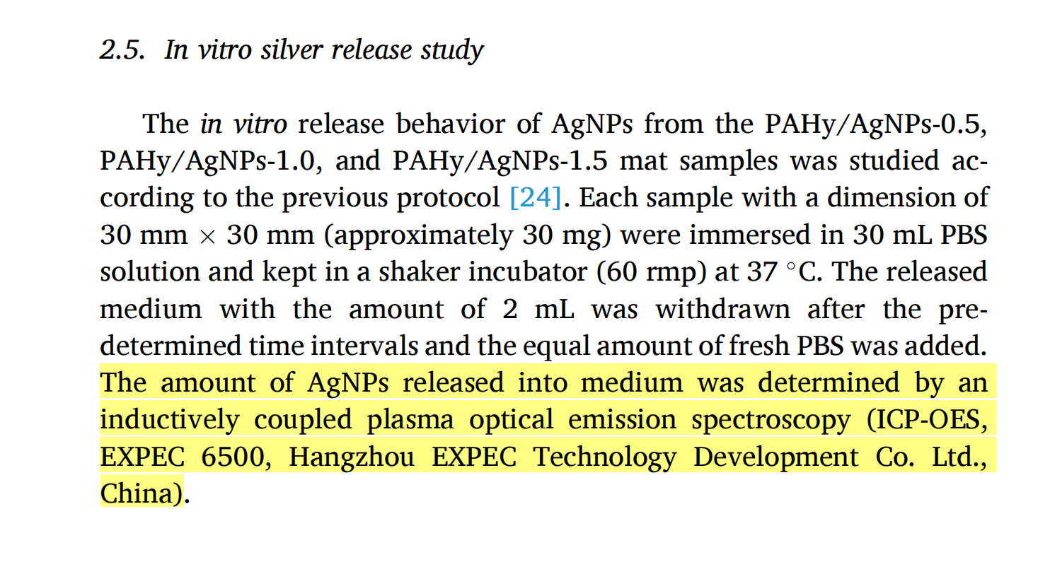 負載納米銀的聚天冬酰肼納米纖維水凝膠敷料中銀的釋放行為對其抗菌性能和細胞毒性有著決定性的影響。研究團隊采用譜育科技EXPEC 6500 電感耦合等離子體發(fā)射光譜儀(ICP-OES)測定了銀的釋放量。為銀釋放行為對水凝膠敷料的抗菌性和細胞毒性影響分析提供有力的數(shù)據(jù)支撐。