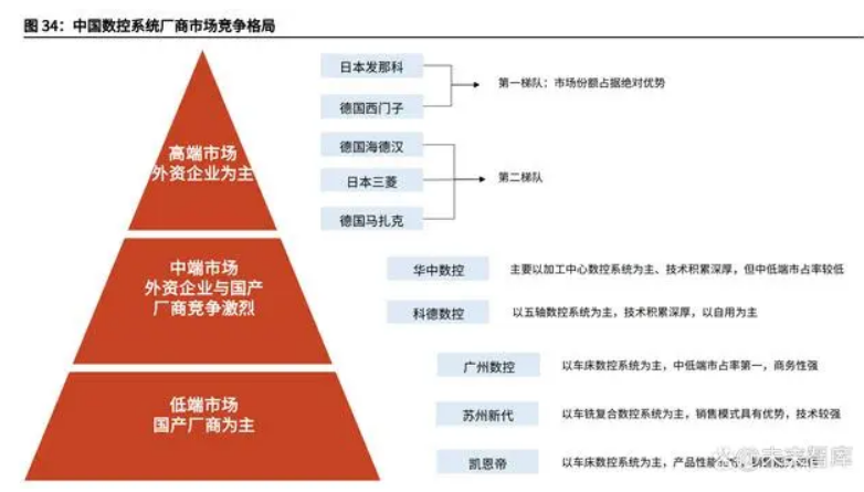 自 2017 年中國科技專項后,數(shù)控系統(tǒng)國產(chǎn)化率實現(xiàn)提升,打破高端市場外資壟 斷局面,但目前中高端市場仍以外資為主,這主要是由于數(shù)控系統(tǒng)的技術(shù)壁壘與 較高的用戶粘性。目前中國數(shù)控系統(tǒng)市場中:高端市場以外資企業(yè)為主,其中第一梯隊代表為日本發(fā)那科、德國西門子,第二 梯隊代表為德國海德漢、日本三菱、德國馬扎克;中端市場面臨外資企業(yè)與國產(chǎn)廠商的激烈競爭,其中國產(chǎn)品牌華中數(shù)控主要以加 工中心數(shù)控系統(tǒng)為主、技術(shù)積累深厚,科德數(shù)控以五軸數(shù)控系統(tǒng)為主,技術(shù)積累 深厚,以自用為主;低端市場以國產(chǎn)廠商為主,如廣州數(shù)控(以車床數(shù)控系統(tǒng)為主,中低端市占率第一,商務(wù)性強)、蘇州新代(以車銑復(fù)合數(shù)控系統(tǒng)為主,銷售模式具有優(yōu)勢,技 術(shù)較強)、凱恩帝(以車床數(shù)控系統(tǒng)為主,產(chǎn)品性能較好,銷售能力較弱)。