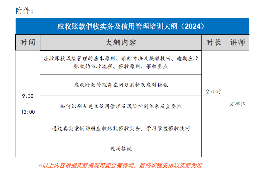 附件:應(yīng)收賬款催收實(shí)務(wù)及信用管理培訓(xùn)大綱(2024)